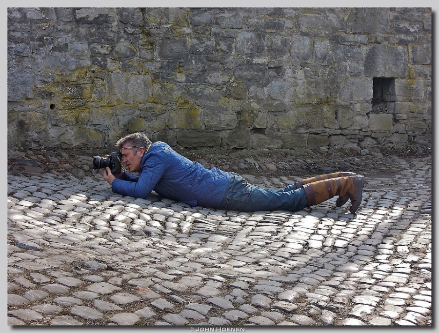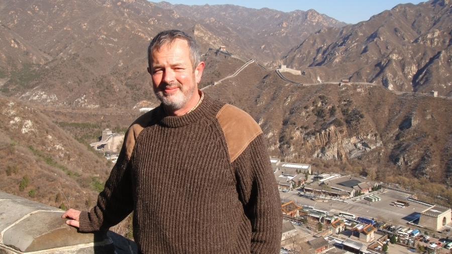 Hans, in zijn mooie warme trui van Hunter, op de Chinese muur!